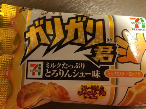 スイーツなガリガリ君 ミルクたっぷりとろりんシュー味。 なんとも長いネーミングではあるが要はセブン-イレブンとのコラボ商品のようだ。 購入するときに気づかなかったがパッケージは3種類あるようだ。 それにしても相変わらずインパクト抜群のキャラクタ…