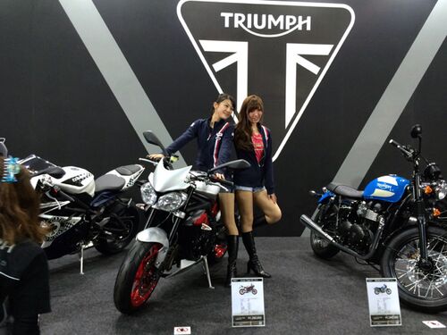 トライアンフは非常に大きな面積を専有しており最近のその勢いを象徴するかのようにコンパニオンの撮影会を大々的にやっているので吸い寄せられるようにブースに入った。 しかしこんなロゴだったっけかな? このマークでこれからは押していくのかもしれない…