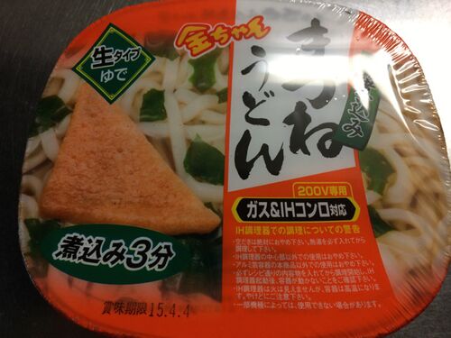金ちゃん鍋煮込み きつねうどん。 値段は定価155円(税抜き)だが事実上100円程度で売られているようだ。 1食(183g)当たり エネルギー 297kcalでなかなか良好な数値と言える。 「麺 のどごしの良さともっちり感が特徴の生タイプ角太麺。 スープ 昆布とかつ…