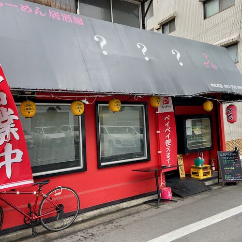 らーめん居酒屋 はてな (???)。 半年くらいまえに来てなかなか美味かったのでまた来てしまった。 駐車場とかはないので近所のコインパーキングにクルマを入れて歩いてきた。 呑みに来たわけじゃないが「本日のおすすめ」が沖縄島らっきょうだったがこれ…