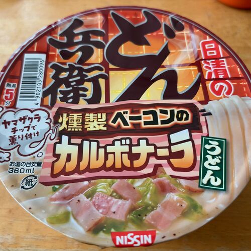 日清のどん兵衛 燻製ベーコンのカルボナーラうどん 希望小売価格 236円 (税別) 二種のチーズと、ブラックペッパーのパンチが効いたカルボナーラ! 燻製の薫り漂う一杯に、食欲が掻き立てられること間違いなし! チーズとブラックペッパーをきかせたパンチのあ…