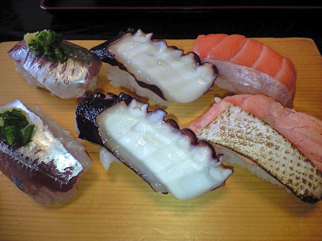 鯵・タコ・サーモンの2貫づつ6つのにぎり寿司。