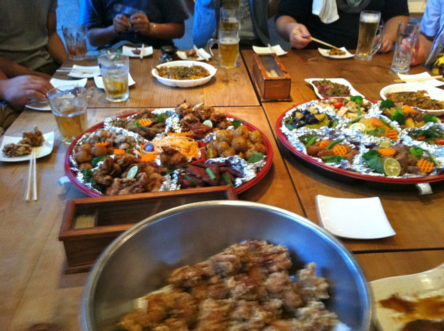 各ラーメン店主と参加者が持ち寄った食事やお酒の数々。
