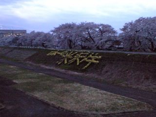 しかし桜満開の川土手に「日本一の米沢牛」って書いてある!!
