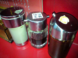 博多ラーメン屋さんらしく替え玉用のラーメンタレが卓上に。