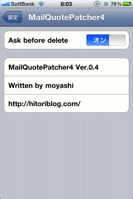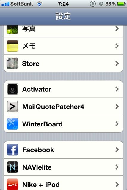 iPhoneを再起動すると設定画面にMailQuotePatcher4が追加されている。