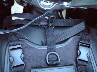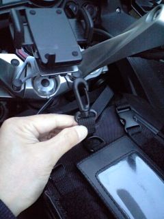 このタンクバッグはこういうヒモでバイクに固定するタイプ。