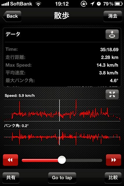 最大バンク角4.6°ってのが笑えるがずっと歩いていたのに最高速14.3km/hは明らかにおかしい。