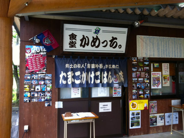 暖簾には「郷土の偉人岸田吟香が広めたたまごかけごはんの店」とかいてある。