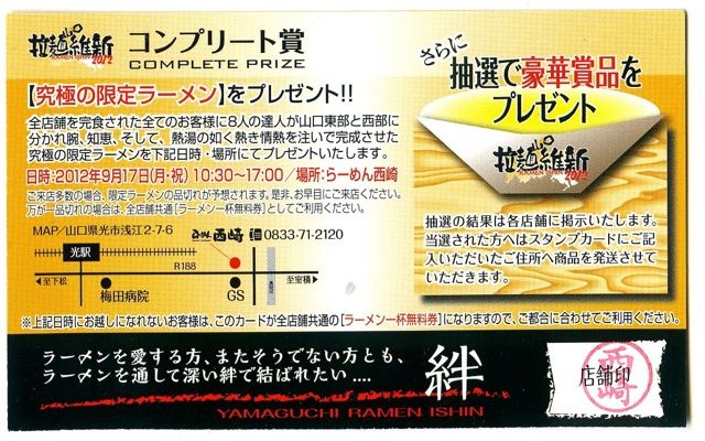 ③全員の方に『2012年9月17日(月)祝日』に『ラーメン西崎・光市』にて参加店の東部の4店舗、西部の4店舗に別れて作るオリジナルラーメン1杯(限定ラーメン)を8人の店主が無料で提供させていただきます。
