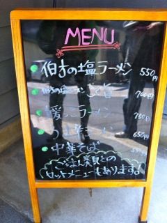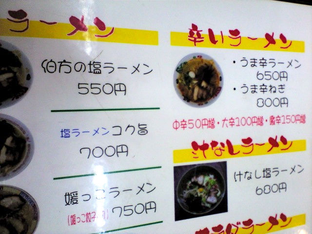 店舗の前にも「伯方の塩ラーメン」と大きくかいてあるのだがその他にも「コク旨ラーメン」や「媛っこラーメン」などなんだか気になるメニューが満載だ(笑)