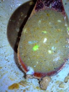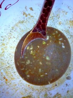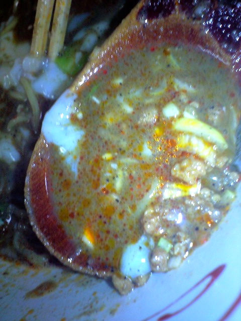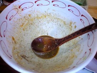 麺がなくなったあとに残ったスープと沈んだミンチ肉(コレも旨いのよ)を食べながら一生懸命考えたがやっぱりよ~わからん(笑)